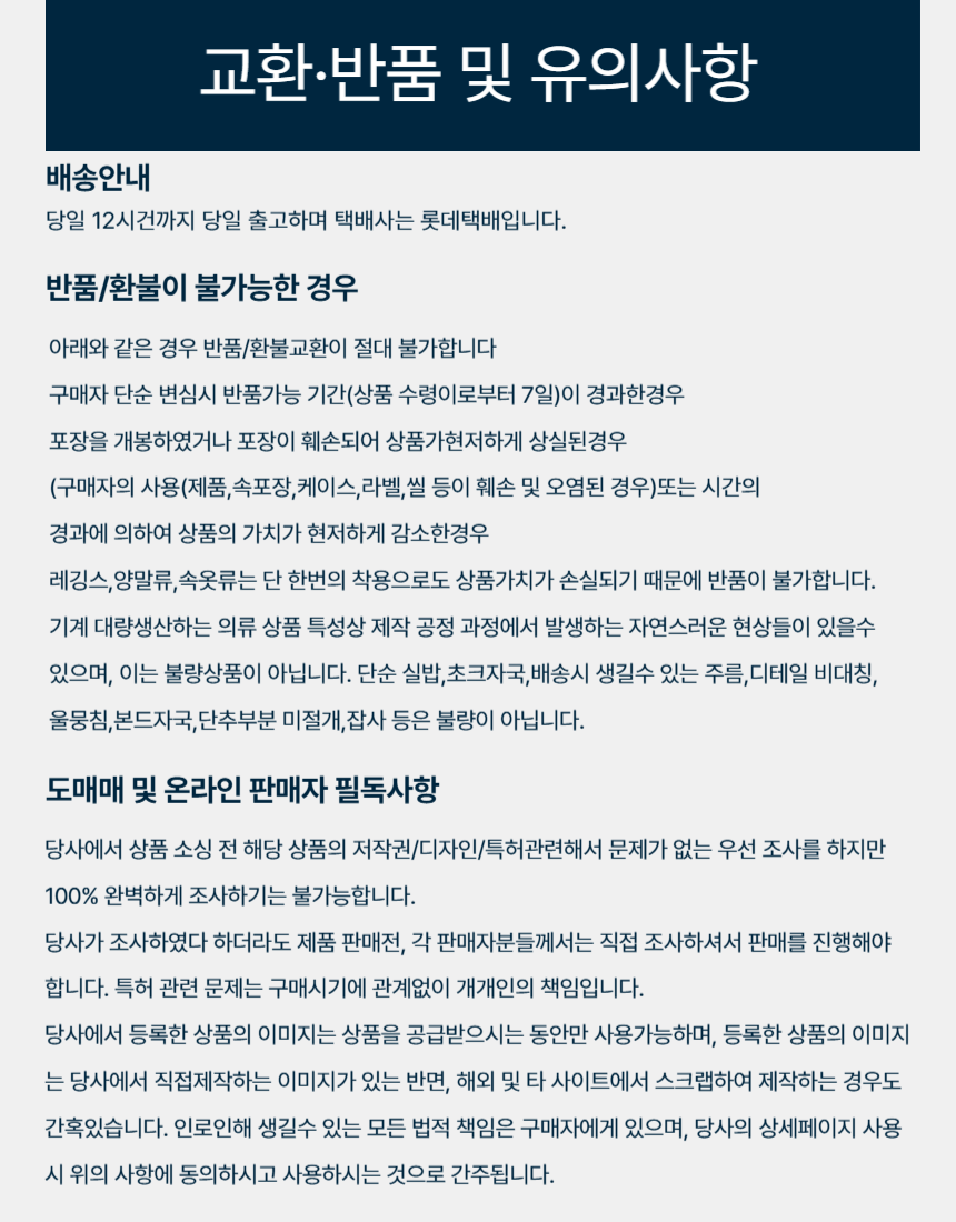 ¹Ýǰ¹è¼Ûºñ : 3,000¿ø (±¸¸ÅÀÚ ´Ü¼ø º¯½ÉÀ¸·Î ÀÎÇÑ ¹Ýǰ¿¡¸¸ ¹Ýǰºñ¿ë ºÎ°ú) Ãʱ⠹è¼Ûºñ°¡ ¹«·á¹è¼ÛÀÌ´ø »óǰÀº ¹Ýǰ¹è¼Ûºñ°¡ ¿Õº¹À¸·Î û±¸µÉ ¼ö ÀÖÀ¸¸ç, ¼ö·®º° ºñ·Ê ¹æ½ÄÀÇ ¹è¼ÛºñÀÎ °æ¿ì ¼ö·®¸¶´Ù ºÎ°úµÇ´Â ºñ¿ëÀÌ »óÀÌÇÏ¿© °ø±Þ»ç¿Í ÇùÀǰ¡ ÇÊ¿äÇÕ´Ï´Ù. Á¦ÁÖ ¹× µµ¼»ê°£ ¹è¼Ûºñ´Â ¹Ýǰ ¹è¼Ûºñ¿¡ Æ÷ÇÔµÇÁö ¾ÊÀ¸´Ï °ø±Þ»ç¿Í ÇùÀǰ¡ ÇÊ¿äÇÕ´Ï´Ù. ±³È¯ ºñ¿ëÀº º¸Åë ¹Ýǰ¹è¼ÛºñÀÇ 2¹è ºÎ°úµÇ³ª, °æ¿ì¿¡ µû¶ó ´Ù¸¦ ¼ö ÀÖÀ¸¹Ç·Î °ø±Þ»ç¿¡ ¹®Àǹٶø´Ï´Ù. |