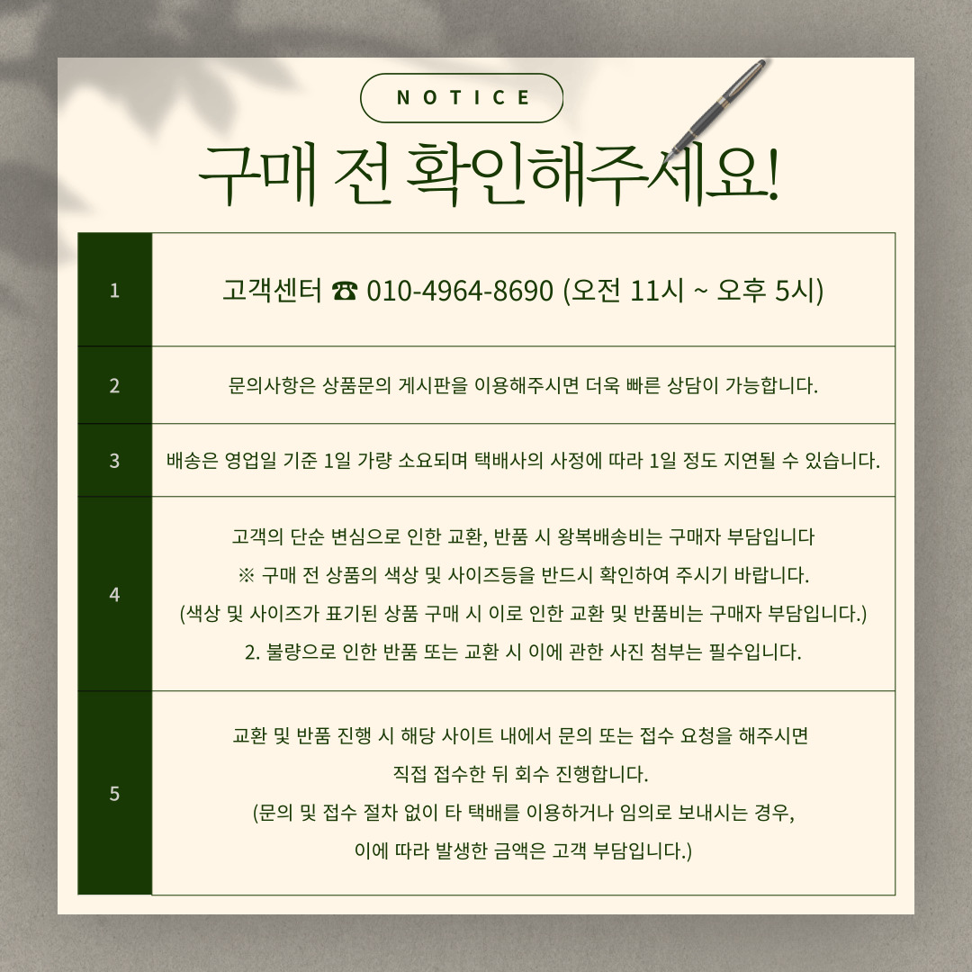 ¹Ýǰ¹è¼Ûºñ : 3,000¿ø (±¸¸ÅÀÚ ´Ü¼ø º¯½ÉÀ¸·Î ÀÎÇÑ ¹Ýǰ¿¡¸¸ ¹Ýǰºñ¿ë ºÎ°ú) Ãʱ⠹è¼Ûºñ°¡ ¹«·á¹è¼ÛÀÌ´ø »óǰÀº ¹Ýǰ¹è¼Ûºñ°¡ ¿Õº¹À¸·Î û±¸µÉ ¼ö ÀÖÀ¸¸ç, ¼ö·®º° ºñ·Ê ¹æ½ÄÀÇ ¹è¼ÛºñÀÎ °æ¿ì ¼ö·®¸¶´Ù ºÎ°úµÇ´Â ºñ¿ëÀÌ »óÀÌÇÏ¿© °ø±Þ»ç¿Í ÇùÀǰ¡ ÇÊ¿äÇÕ´Ï´Ù. Á¦ÁÖ ¹× µµ¼»ê°£ ¹è¼Ûºñ´Â ¹Ýǰ ¹è¼Ûºñ¿¡ Æ÷ÇÔµÇÁö ¾ÊÀ¸´Ï °ø±Þ»ç¿Í ÇùÀǰ¡ ÇÊ¿äÇÕ´Ï´Ù. ±³È¯ ºñ¿ëÀº º¸Åë ¹Ýǰ¹è¼ÛºñÀÇ 2¹è ºÎ°úµÇ³ª, °æ¿ì¿¡ µû¶ó ´Ù¸¦ ¼ö ÀÖÀ¸¹Ç·Î °ø±Þ»ç¿¡ ¹®Àǹٶø´Ï´Ù. |