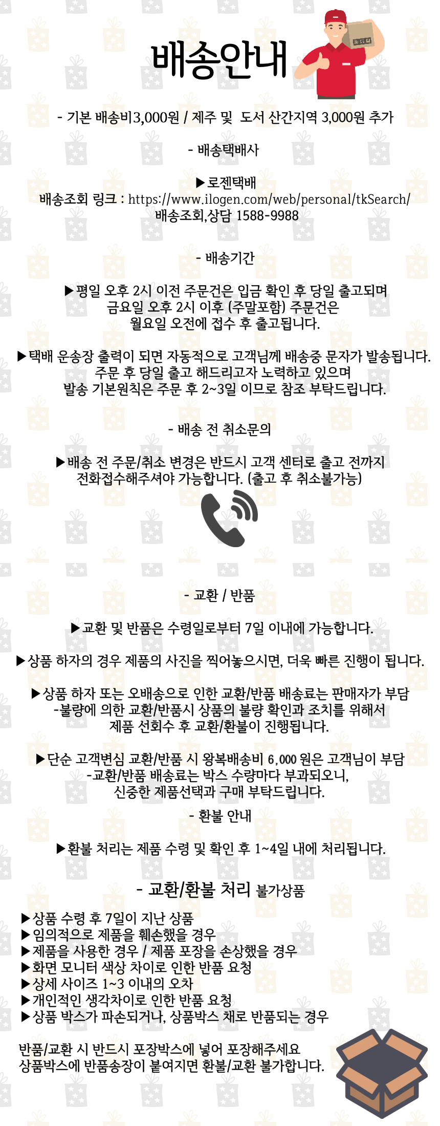 ¹Ýǰ¹è¼Ûºñ : 3,000¿ø (±¸¸ÅÀÚ ´Ü¼ø º¯½ÉÀ¸·Î ÀÎÇÑ ¹Ýǰ¿¡¸¸ ¹Ýǰºñ¿ë ºÎ°ú) Ãʱ⠹è¼Ûºñ°¡ ¹«·á¹è¼ÛÀÌ´ø »óǰÀº ¹Ýǰ¹è¼Ûºñ°¡ ¿Õº¹À¸·Î û±¸µÉ ¼ö ÀÖÀ¸¸ç, ¼ö·®º° ºñ·Ê ¹æ½ÄÀÇ ¹è¼ÛºñÀÎ °æ¿ì ¼ö·®¸¶´Ù ºÎ°úµÇ´Â ºñ¿ëÀÌ »óÀÌÇÏ¿© °ø±Þ»ç¿Í ÇùÀǰ¡ ÇÊ¿äÇÕ´Ï´Ù. Á¦ÁÖ ¹× µµ¼»ê°£ ¹è¼Ûºñ´Â ¹Ýǰ ¹è¼Ûºñ¿¡ Æ÷ÇÔµÇÁö ¾ÊÀ¸´Ï °ø±Þ»ç¿Í ÇùÀǰ¡ ÇÊ¿äÇÕ´Ï´Ù. ±³È¯ ºñ¿ëÀº º¸Åë ¹Ýǰ¹è¼ÛºñÀÇ 2¹è ºÎ°úµÇ³ª, °æ¿ì¿¡ µû¶ó ´Ù¸¦ ¼ö ÀÖÀ¸¹Ç·Î °ø±Þ»ç¿¡ ¹®Àǹٶø´Ï´Ù. |
