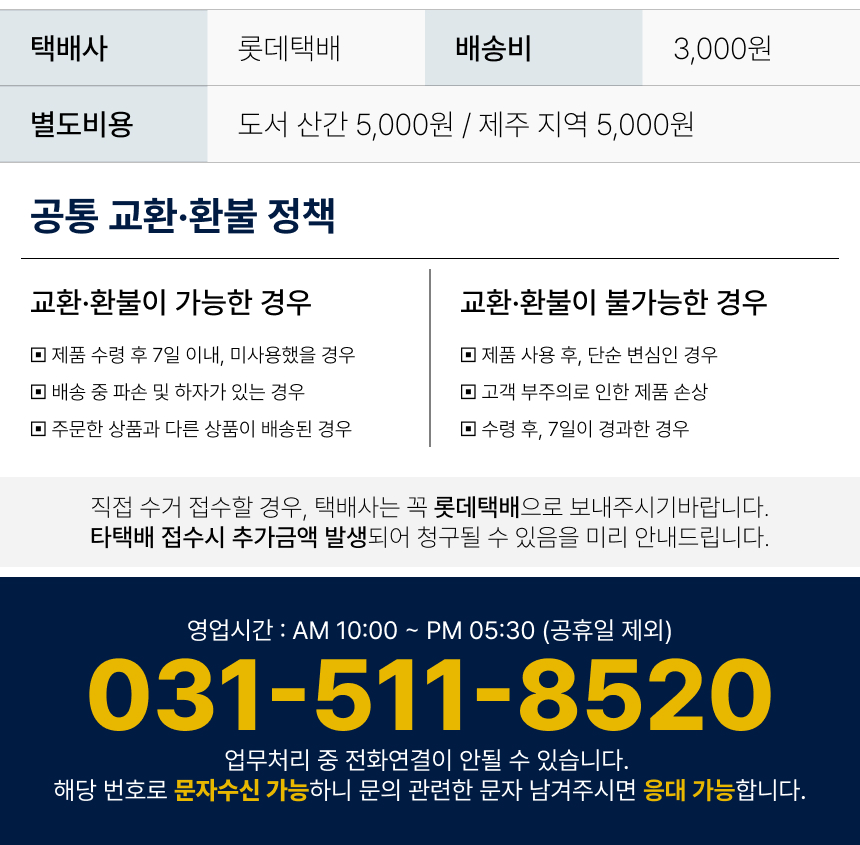 ¹Ýǰ¹è¼Ûºñ : 2,500¿ø (±¸¸ÅÀÚ ´Ü¼ø º¯½ÉÀ¸·Î ÀÎÇÑ ¹Ýǰ¿¡¸¸ ¹Ýǰºñ¿ë ºÎ°ú) Ãʱ⠹è¼Ûºñ°¡ ¹«·á¹è¼ÛÀÌ´ø »óǰÀº ¹Ýǰ¹è¼Ûºñ°¡ ¿Õº¹À¸·Î û±¸µÉ ¼ö ÀÖÀ¸¸ç, ¼ö·®º° ºñ·Ê ¹æ½ÄÀÇ ¹è¼ÛºñÀÎ °æ¿ì ¼ö·®¸¶´Ù ºÎ°úµÇ´Â ºñ¿ëÀÌ »óÀÌÇÏ¿© °ø±Þ»ç¿Í ÇùÀǰ¡ ÇÊ¿äÇÕ´Ï´Ù. Á¦ÁÖ ¹× µµ¼»ê°£ ¹è¼Ûºñ´Â ¹Ýǰ ¹è¼Ûºñ¿¡ Æ÷ÇÔµÇÁö ¾ÊÀ¸´Ï °ø±Þ»ç¿Í ÇùÀǰ¡ ÇÊ¿äÇÕ´Ï´Ù. ±³È¯ ºñ¿ëÀº º¸Åë ¹Ýǰ¹è¼ÛºñÀÇ 2¹è ºÎ°úµÇ³ª, °æ¿ì¿¡ µû¶ó ´Ù¸¦ ¼ö ÀÖÀ¸¹Ç·Î °ø±Þ»ç¿¡ ¹®Àǹٶø´Ï´Ù. |