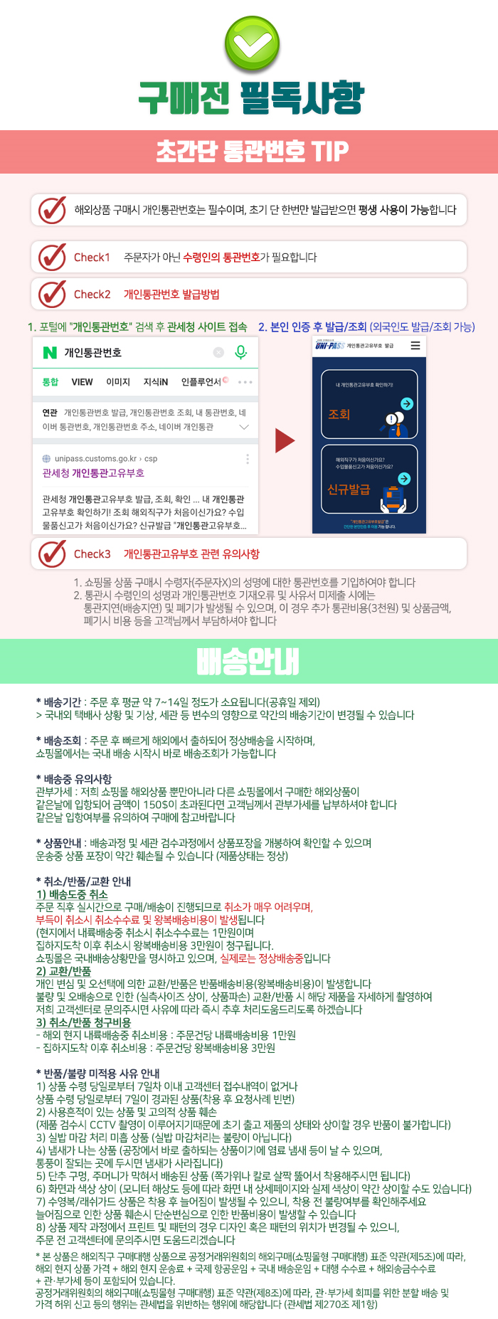 ¹Ýǰ¹è¼Ûºñ : 15,000¿ø (±¸¸ÅÀÚ ´Ü¼ø º¯½ÉÀ¸·Î ÀÎÇÑ ¹Ýǰ¿¡¸¸ ¹Ýǰºñ¿ë ºÎ°ú) Ãʱ⠹è¼Ûºñ°¡ ¹«·á¹è¼ÛÀÌ´ø »óǰÀº ¹Ýǰ¹è¼Ûºñ°¡ ¿Õº¹À¸·Î û±¸µÉ ¼ö ÀÖÀ¸¸ç, ¼ö·®º° ºñ·Ê ¹æ½ÄÀÇ ¹è¼ÛºñÀÎ °æ¿ì ¼ö·®¸¶´Ù ºÎ°úµÇ´Â ºñ¿ëÀÌ »óÀÌÇÏ¿© °ø±Þ»ç¿Í ÇùÀǰ¡ ÇÊ¿äÇÕ´Ï´Ù. Á¦ÁÖ ¹× µµ¼»ê°£ ¹è¼Ûºñ´Â ¹Ýǰ ¹è¼Ûºñ¿¡ Æ÷ÇÔµÇÁö ¾ÊÀ¸´Ï °ø±Þ»ç¿Í ÇùÀǰ¡ ÇÊ¿äÇÕ´Ï´Ù. ±³È¯ ºñ¿ëÀº º¸Åë ¹Ýǰ¹è¼ÛºñÀÇ 2¹è ºÎ°úµÇ³ª, °æ¿ì¿¡ µû¶ó ´Ù¸¦ ¼ö ÀÖÀ¸¹Ç·Î °ø±Þ»ç¿¡ ¹®Àǹٶø´Ï´Ù.  |