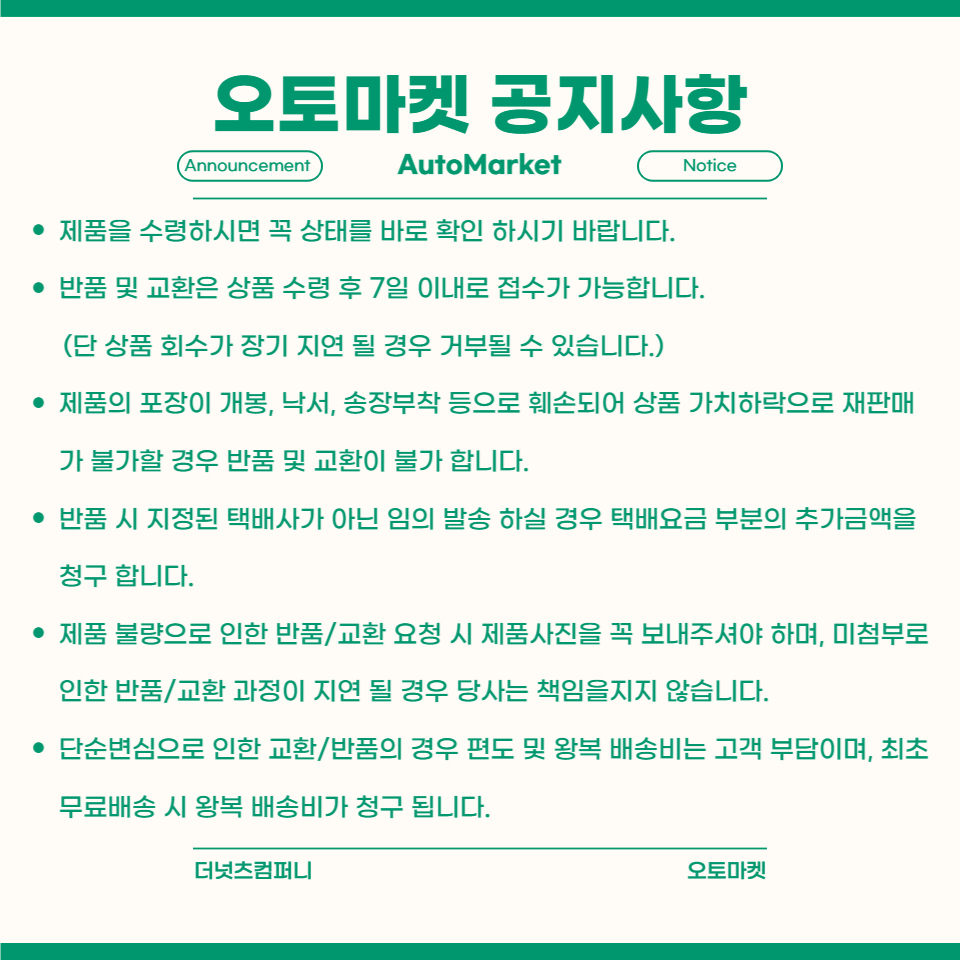 ¹Ýǰ¹è¼Ûºñ : 4,000¿ø (±¸¸ÅÀÚ ´Ü¼ø º¯½ÉÀ¸·Î ÀÎÇÑ ¹Ýǰ¿¡¸¸ ¹Ýǰºñ¿ë ºÎ°ú) Ãʱ⠹è¼Ûºñ°¡ ¹«·á¹è¼ÛÀÌ´ø »óǰÀº ¹Ýǰ¹è¼Ûºñ°¡ ¿Õº¹À¸·Î û±¸µÉ ¼ö ÀÖÀ¸¸ç, ¼ö·®º° ºñ·Ê ¹æ½ÄÀÇ ¹è¼ÛºñÀÎ °æ¿ì ¼ö·®¸¶´Ù ºÎ°úµÇ´Â ºñ¿ëÀÌ »óÀÌÇÏ¿© °ø±Þ»ç¿Í ÇùÀǰ¡ ÇÊ¿äÇÕ´Ï´Ù. Á¦ÁÖ ¹× µµ¼»ê°£ ¹è¼Ûºñ´Â ¹Ýǰ ¹è¼Ûºñ¿¡ Æ÷ÇÔµÇÁö ¾ÊÀ¸´Ï °ø±Þ»ç¿Í ÇùÀǰ¡ ÇÊ¿äÇÕ´Ï´Ù. ±³È¯ ºñ¿ëÀº º¸Åë ¹Ýǰ¹è¼ÛºñÀÇ 2¹è ºÎ°úµÇ³ª, °æ¿ì¿¡ µû¶ó ´Ù¸¦ ¼ö ÀÖÀ¸¹Ç·Î °ø±Þ»ç¿¡ ¹®Àǹٶø´Ï´Ù. |