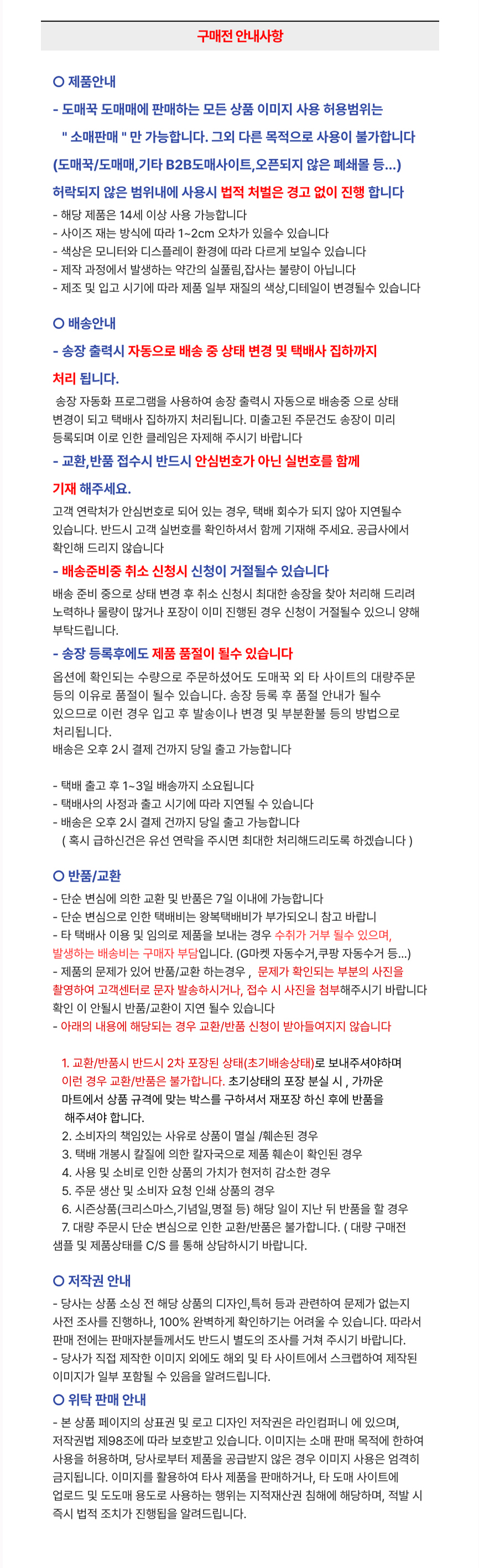¹Ýǰ¹è¼Ûºñ : 3,000¿ø (±¸¸ÅÀÚ ´Ü¼ø º¯½ÉÀ¸·Î ÀÎÇÑ ¹Ýǰ¿¡¸¸ ¹Ýǰºñ¿ë ºÎ°ú) Ãʱ⠹è¼Ûºñ°¡ ¹«·á¹è¼ÛÀÌ´ø »óǰÀº ¹Ýǰ¹è¼Ûºñ°¡ ¿Õº¹À¸·Î û±¸µÉ ¼ö ÀÖÀ¸¸ç, ¼ö·®º° ºñ·Ê ¹æ½ÄÀÇ ¹è¼ÛºñÀÎ °æ¿ì ¼ö·®¸¶´Ù ºÎ°úµÇ´Â ºñ¿ëÀÌ »óÀÌÇÏ¿© °ø±Þ»ç¿Í ÇùÀǰ¡ ÇÊ¿äÇÕ´Ï´Ù. Á¦ÁÖ ¹× µµ¼»ê°£ ¹è¼Ûºñ´Â ¹Ýǰ ¹è¼Ûºñ¿¡ Æ÷ÇÔµÇÁö ¾ÊÀ¸´Ï °ø±Þ»ç¿Í ÇùÀǰ¡ ÇÊ¿äÇÕ´Ï´Ù. ±³È¯ ºñ¿ëÀº º¸Åë ¹Ýǰ¹è¼ÛºñÀÇ 2¹è ºÎ°úµÇ³ª, °æ¿ì¿¡ µû¶ó ´Ù¸¦ ¼ö ÀÖÀ¸¹Ç·Î °ø±Þ»ç¿¡ ¹®Àǹٶø´Ï´Ù. |