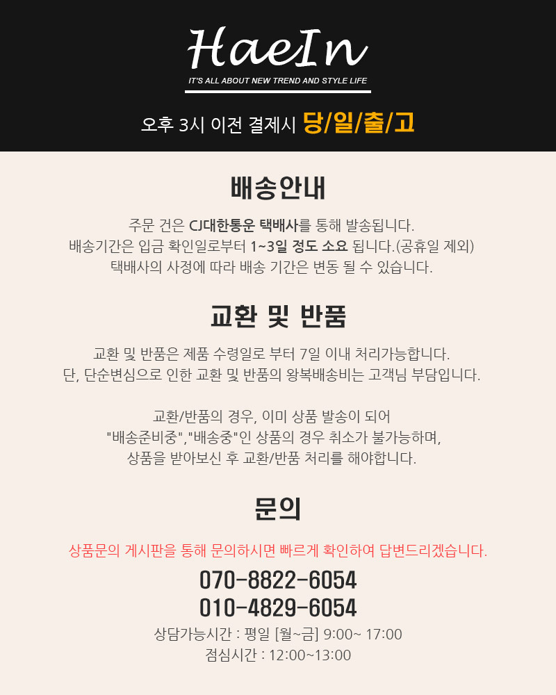 | ¹®ÀǹøÈ£ | 070-8822-6054 | À̸ÞÀÏ | haeinshop@naver.com |