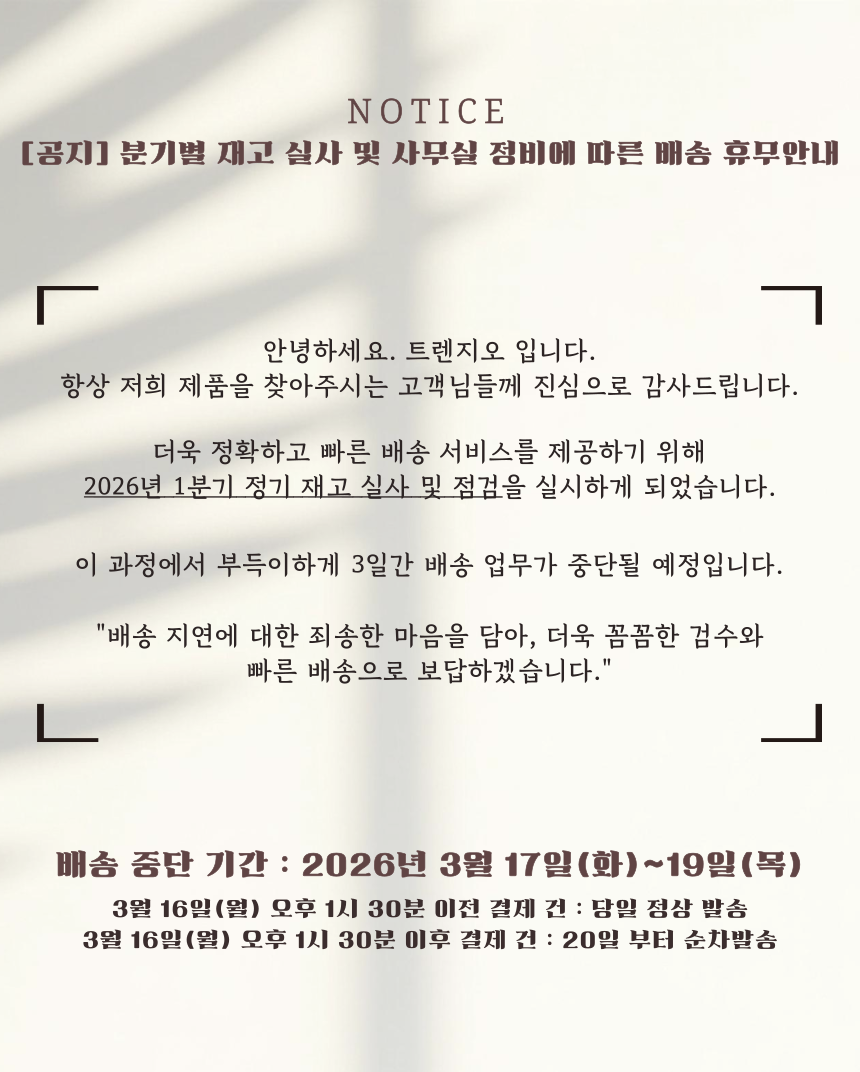 ¹Ýǰ¹è¼Ûºñ : 3,500¿ø (±¸¸ÅÀÚ ´Ü¼ø º¯½ÉÀ¸·Î ÀÎÇÑ ¹Ýǰ¿¡¸¸ ¹Ýǰºñ¿ë ºÎ°ú) Ãʱ⠹è¼Ûºñ°¡ ¹«·á¹è¼ÛÀÌ´ø »óǰÀº ¹Ýǰ¹è¼Ûºñ°¡ ¿Õº¹À¸·Î û±¸µÉ ¼ö ÀÖÀ¸¸ç, ¼ö·®º° ºñ·Ê ¹æ½ÄÀÇ ¹è¼ÛºñÀÎ °æ¿ì ¼ö·®¸¶´Ù ºÎ°úµÇ´Â ºñ¿ëÀÌ »óÀÌÇÏ¿© °ø±Þ»ç¿Í ÇùÀǰ¡ ÇÊ¿äÇÕ´Ï´Ù. Á¦ÁÖ ¹× µµ¼»ê°£ ¹è¼Ûºñ´Â ¹Ýǰ ¹è¼Ûºñ¿¡ Æ÷ÇÔµÇÁö ¾ÊÀ¸´Ï °ø±Þ»ç¿Í ÇùÀǰ¡ ÇÊ¿äÇÕ´Ï´Ù. ±³È¯ ºñ¿ëÀº º¸Åë ¹Ýǰ¹è¼ÛºñÀÇ 2¹è ºÎ°úµÇ³ª, °æ¿ì¿¡ µû¶ó ´Ù¸¦ ¼ö ÀÖÀ¸¹Ç·Î °ø±Þ»ç¿¡ ¹®Àǹٶø´Ï´Ù. |