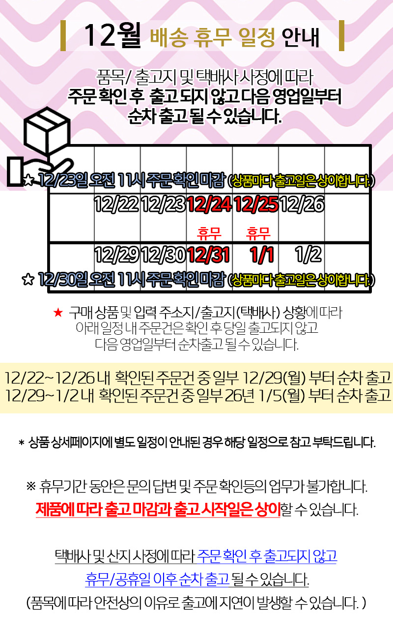 ¹Ýǰ¹è¼Ûºñ : 4,000¿ø (±¸¸ÅÀÚ ´Ü¼ø º¯½ÉÀ¸·Î ÀÎÇÑ ¹Ýǰ¿¡¸¸ ¹Ýǰºñ¿ë ºÎ°ú) Ãʱ⠹è¼Ûºñ°¡ ¹«·á¹è¼ÛÀÌ´ø »óǰÀº ¹Ýǰ¹è¼Ûºñ°¡ ¿Õº¹À¸·Î û±¸µÉ ¼ö ÀÖÀ¸¸ç, ¼ö·®º° ºñ·Ê ¹æ½ÄÀÇ ¹è¼ÛºñÀÎ °æ¿ì ¼ö·®¸¶´Ù ºÎ°úµÇ´Â ºñ¿ëÀÌ »óÀÌÇÏ¿© °ø±Þ»ç¿Í ÇùÀǰ¡ ÇÊ¿äÇÕ´Ï´Ù. Á¦ÁÖ ¹× µµ¼»ê°£ ¹è¼Ûºñ´Â ¹Ýǰ ¹è¼Ûºñ¿¡ Æ÷ÇÔµÇÁö ¾ÊÀ¸´Ï °ø±Þ»ç¿Í ÇùÀǰ¡ ÇÊ¿äÇÕ´Ï´Ù. ±³È¯ ºñ¿ëÀº º¸Åë ¹Ýǰ¹è¼ÛºñÀÇ 2¹è ºÎ°úµÇ³ª, °æ¿ì¿¡ µû¶ó ´Ù¸¦ ¼ö ÀÖÀ¸¹Ç·Î °ø±Þ»ç¿¡ ¹®Àǹٶø´Ï´Ù. |
