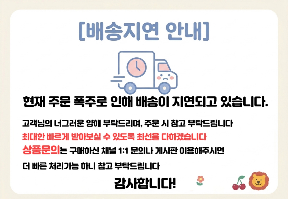 ¹Ýǰ¹è¼Ûºñ : 3,000¿ø (±¸¸ÅÀÚ ´Ü¼ø º¯½ÉÀ¸·Î ÀÎÇÑ ¹Ýǰ¿¡¸¸ ¹Ýǰºñ¿ë ºÎ°ú) Ãʱ⠹è¼Ûºñ°¡ ¹«·á¹è¼ÛÀÌ´ø »óǰÀº ¹Ýǰ¹è¼Ûºñ°¡ ¿Õº¹À¸·Î û±¸µÉ ¼ö ÀÖÀ¸¸ç, ¼ö·®º° ºñ·Ê ¹æ½ÄÀÇ ¹è¼ÛºñÀÎ °æ¿ì ¼ö·®¸¶´Ù ºÎ°úµÇ´Â ºñ¿ëÀÌ »óÀÌÇÏ¿© °ø±Þ»ç¿Í ÇùÀǰ¡ ÇÊ¿äÇÕ´Ï´Ù. Á¦ÁÖ ¹× µµ¼»ê°£ ¹è¼Ûºñ´Â ¹Ýǰ ¹è¼Ûºñ¿¡ Æ÷ÇÔµÇÁö ¾ÊÀ¸´Ï °ø±Þ»ç¿Í ÇùÀǰ¡ ÇÊ¿äÇÕ´Ï´Ù. ±³È¯ ºñ¿ëÀº º¸Åë ¹Ýǰ¹è¼ÛºñÀÇ 2¹è ºÎ°úµÇ³ª, °æ¿ì¿¡ µû¶ó ´Ù¸¦ ¼ö ÀÖÀ¸¹Ç·Î °ø±Þ»ç¿¡ ¹®Àǹٶø´Ï´Ù. |