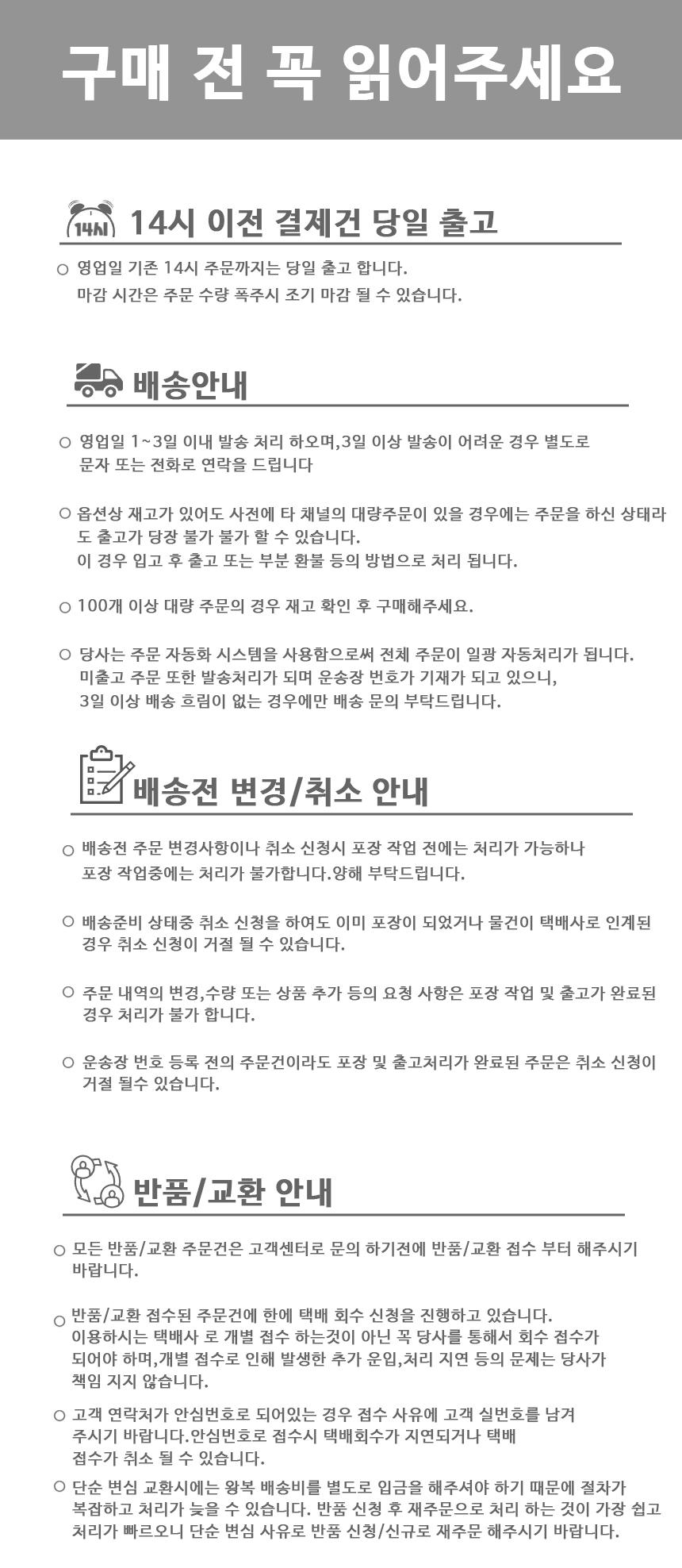 ¹Ýǰ¹è¼Ûºñ : 3,500¿ø (±¸¸ÅÀÚ ´Ü¼ø º¯½ÉÀ¸·Î ÀÎÇÑ ¹Ýǰ¿¡¸¸ ¹Ýǰºñ¿ë ºÎ°ú) Ãʱ⠹è¼Ûºñ°¡ ¹«·á¹è¼ÛÀÌ´ø »óǰÀº ¹Ýǰ¹è¼Ûºñ°¡ ¿Õº¹À¸·Î û±¸µÉ ¼ö ÀÖÀ¸¸ç, ¼ö·®º° ºñ·Ê ¹æ½ÄÀÇ ¹è¼ÛºñÀÎ °æ¿ì ¼ö·®¸¶´Ù ºÎ°úµÇ´Â ºñ¿ëÀÌ »óÀÌÇÏ¿© °ø±Þ»ç¿Í ÇùÀǰ¡ ÇÊ¿äÇÕ´Ï´Ù. Á¦ÁÖ ¹× µµ¼»ê°£ ¹è¼Ûºñ´Â ¹Ýǰ ¹è¼Ûºñ¿¡ Æ÷ÇÔµÇÁö ¾ÊÀ¸´Ï °ø±Þ»ç¿Í ÇùÀǰ¡ ÇÊ¿äÇÕ´Ï´Ù. ±³È¯ ºñ¿ëÀº º¸Åë ¹Ýǰ¹è¼ÛºñÀÇ 2¹è ºÎ°úµÇ³ª, °æ¿ì¿¡ µû¶ó ´Ù¸¦ ¼ö ÀÖÀ¸¹Ç·Î °ø±Þ»ç¿¡ ¹®Àǹٶø´Ï´Ù. |