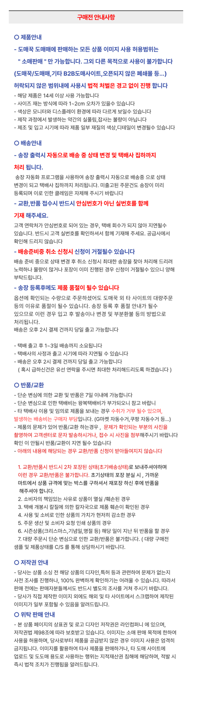 ¹Ýǰ¹è¼Ûºñ : 4,000¿ø (±¸¸ÅÀÚ ´Ü¼ø º¯½ÉÀ¸·Î ÀÎÇÑ ¹Ýǰ¿¡¸¸ ¹Ýǰºñ¿ë ºÎ°ú) Ãʱ⠹è¼Ûºñ°¡ ¹«·á¹è¼ÛÀÌ´ø »óǰÀº ¹Ýǰ¹è¼Ûºñ°¡ ¿Õº¹À¸·Î û±¸µÉ ¼ö ÀÖÀ¸¸ç, ¼ö·®º° ºñ·Ê ¹æ½ÄÀÇ ¹è¼ÛºñÀÎ °æ¿ì ¼ö·®¸¶´Ù ºÎ°úµÇ´Â ºñ¿ëÀÌ »óÀÌÇÏ¿© °ø±Þ»ç¿Í ÇùÀǰ¡ ÇÊ¿äÇÕ´Ï´Ù. Á¦ÁÖ ¹× µµ¼»ê°£ ¹è¼Ûºñ´Â ¹Ýǰ ¹è¼Ûºñ¿¡ Æ÷ÇÔµÇÁö ¾ÊÀ¸´Ï °ø±Þ»ç¿Í ÇùÀǰ¡ ÇÊ¿äÇÕ´Ï´Ù. ±³È¯ ºñ¿ëÀº º¸Åë ¹Ýǰ¹è¼ÛºñÀÇ 2¹è ºÎ°úµÇ³ª, °æ¿ì¿¡ µû¶ó ´Ù¸¦ ¼ö ÀÖÀ¸¹Ç·Î °ø±Þ»ç¿¡ ¹®Àǹٶø´Ï´Ù. |