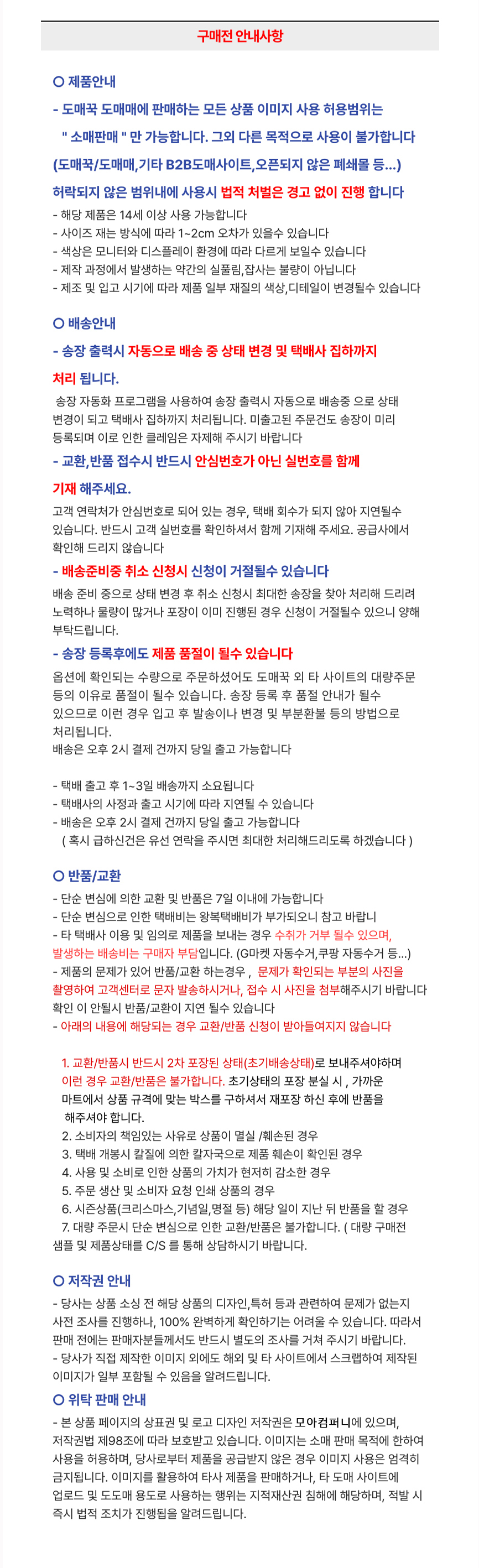 ¹Ýǰ¹è¼Ûºñ : 4,000¿ø (±¸¸ÅÀÚ ´Ü¼ø º¯½ÉÀ¸·Î ÀÎÇÑ ¹Ýǰ¿¡¸¸ ¹Ýǰºñ¿ë ºÎ°ú) Ãʱ⠹è¼Ûºñ°¡ ¹«·á¹è¼ÛÀÌ´ø »óǰÀº ¹Ýǰ¹è¼Ûºñ°¡ ¿Õº¹À¸·Î û±¸µÉ ¼ö ÀÖÀ¸¸ç, ¼ö·®º° ºñ·Ê ¹æ½ÄÀÇ ¹è¼ÛºñÀÎ °æ¿ì ¼ö·®¸¶´Ù ºÎ°úµÇ´Â ºñ¿ëÀÌ »óÀÌÇÏ¿© °ø±Þ»ç¿Í ÇùÀǰ¡ ÇÊ¿äÇÕ´Ï´Ù. Á¦ÁÖ ¹× µµ¼»ê°£ ¹è¼Ûºñ´Â ¹Ýǰ ¹è¼Ûºñ¿¡ Æ÷ÇÔµÇÁö ¾ÊÀ¸´Ï °ø±Þ»ç¿Í ÇùÀǰ¡ ÇÊ¿äÇÕ´Ï´Ù. ±³È¯ ºñ¿ëÀº º¸Åë ¹Ýǰ¹è¼ÛºñÀÇ 2¹è ºÎ°úµÇ³ª, °æ¿ì¿¡ µû¶ó ´Ù¸¦ ¼ö ÀÖÀ¸¹Ç·Î °ø±Þ»ç¿¡ ¹®Àǹٶø´Ï´Ù. |