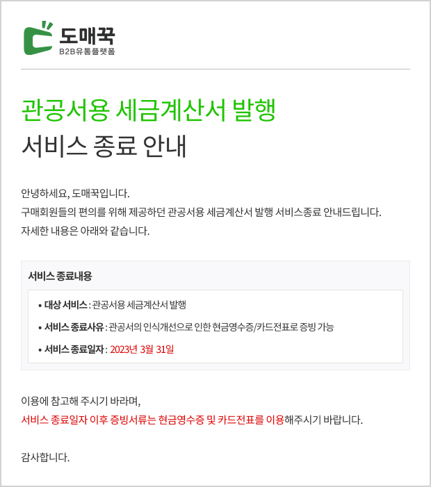 | 349 | [°øÁö] °ü°ø¼¿ë ¼¼±Ý°è»ê¼ ¹ßÇà ¼ºñ½º Á¾·á ¾È³» | 23/03/08 |
